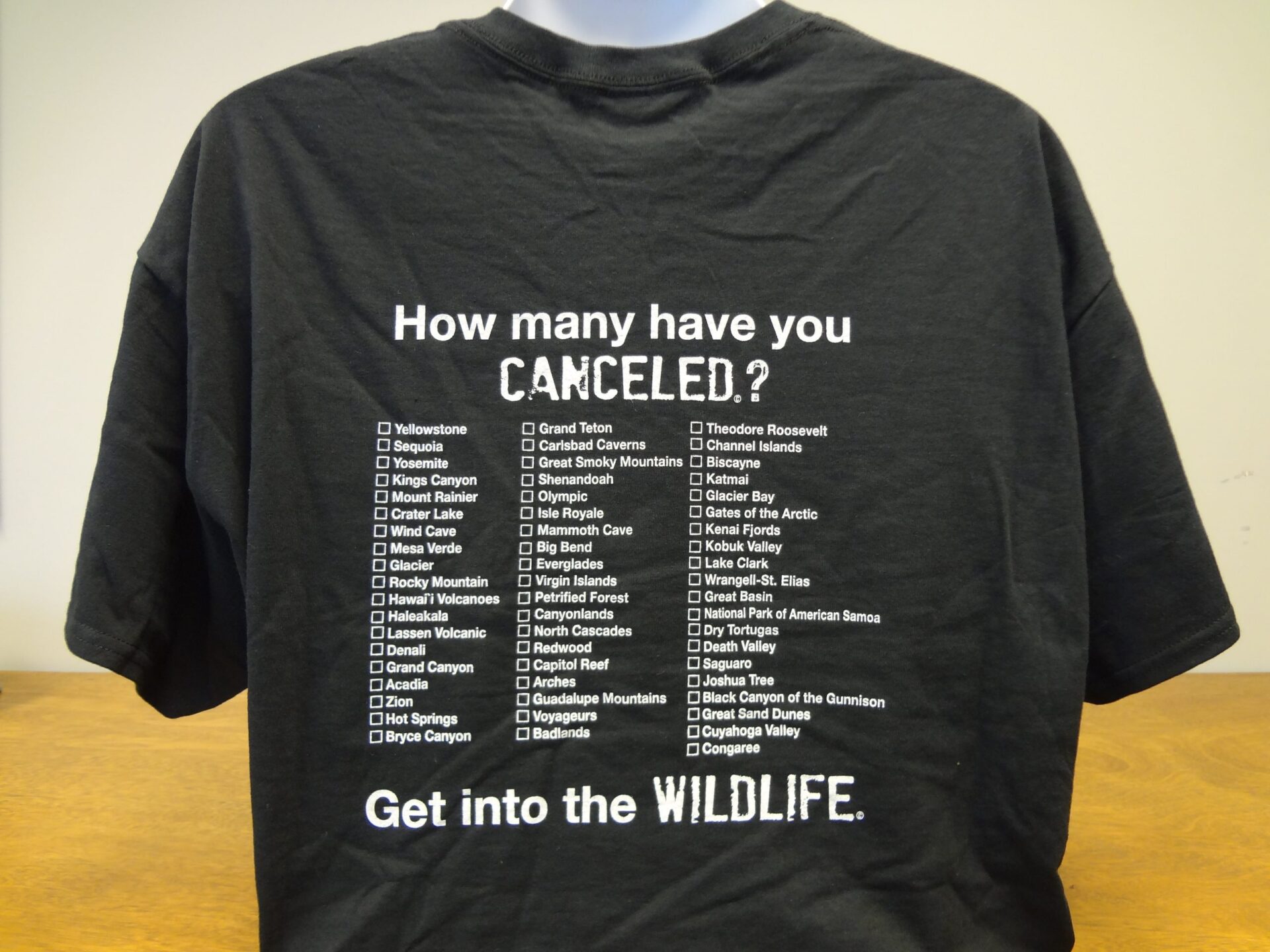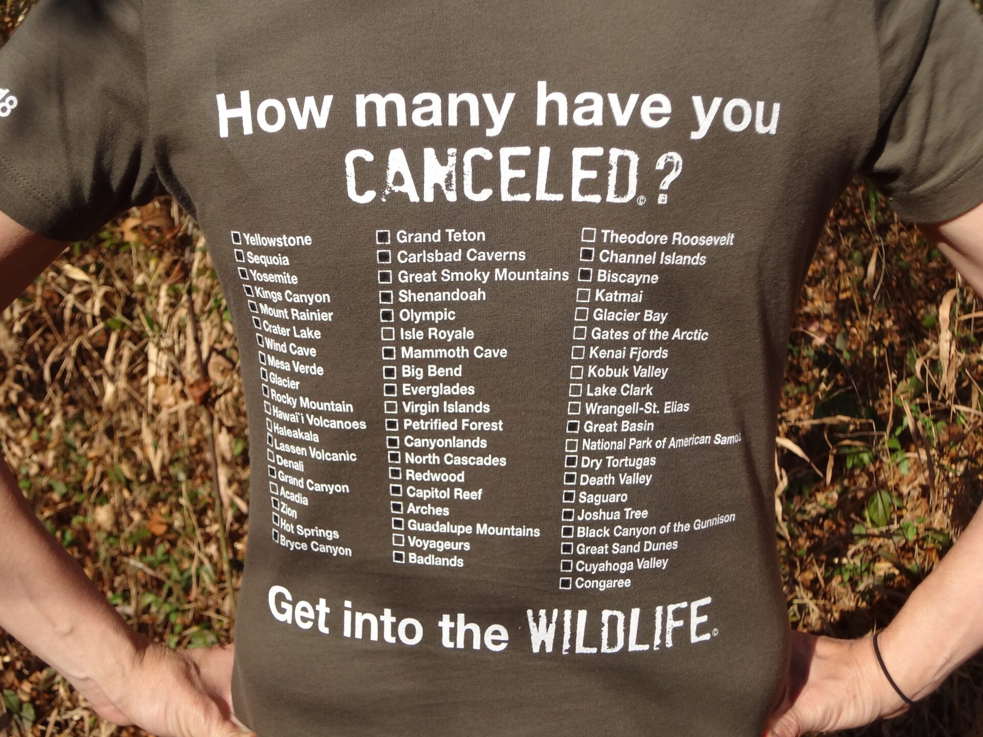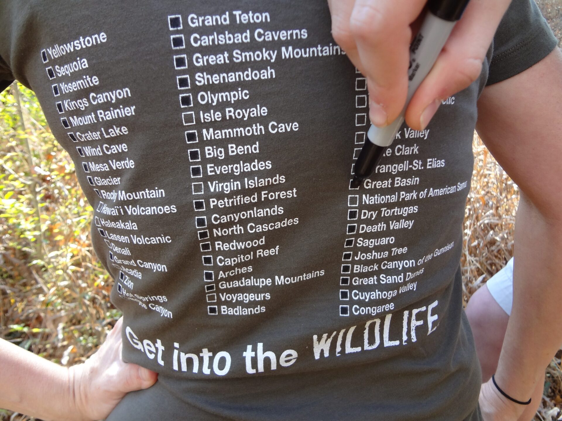 As you cancel a park, you simply color in the box on the back of your tee shirt. You should use a black permanent marker or dark fabric market. It is fun, rewarding and provides you with a tremendous sense of pride.