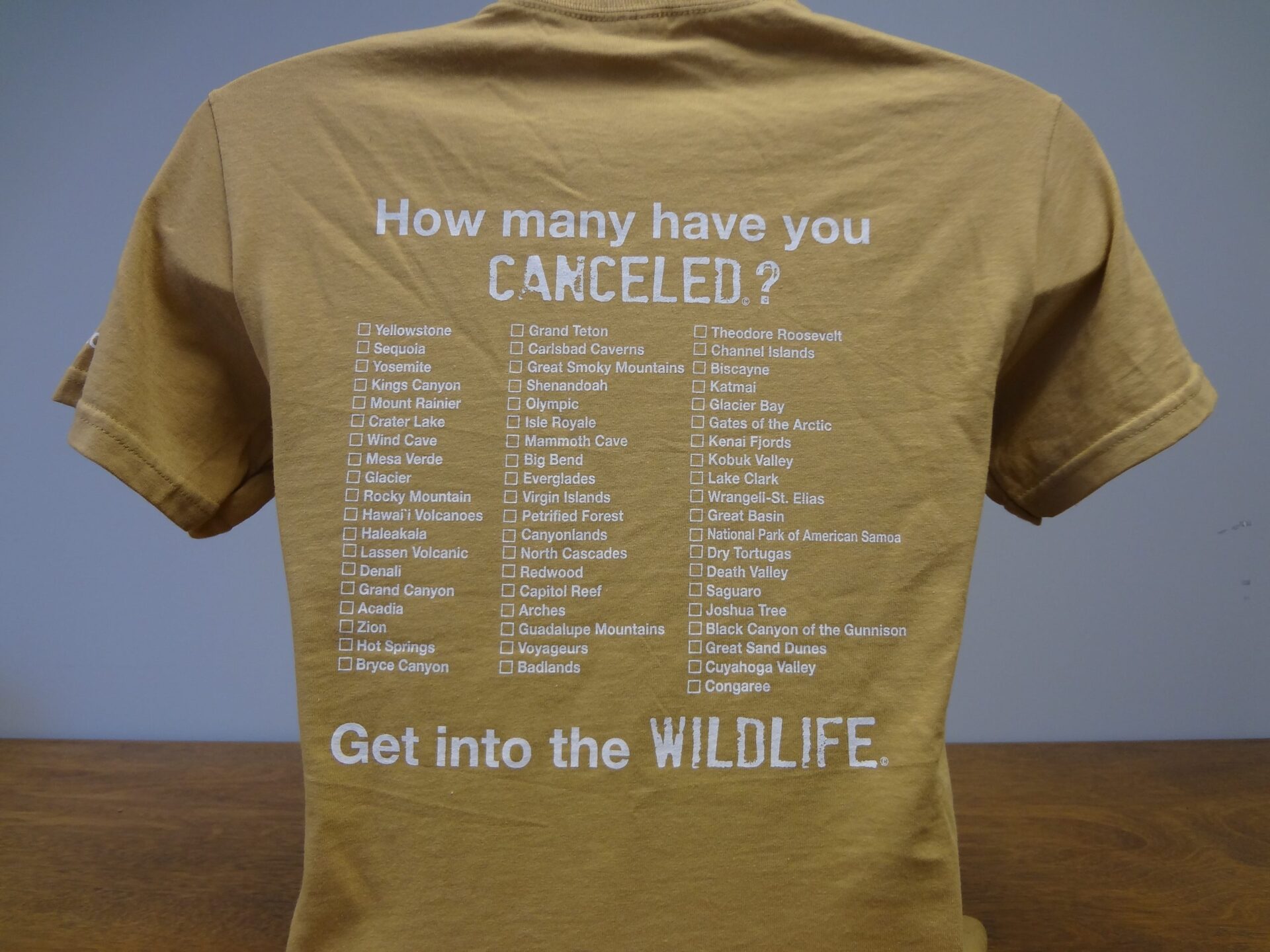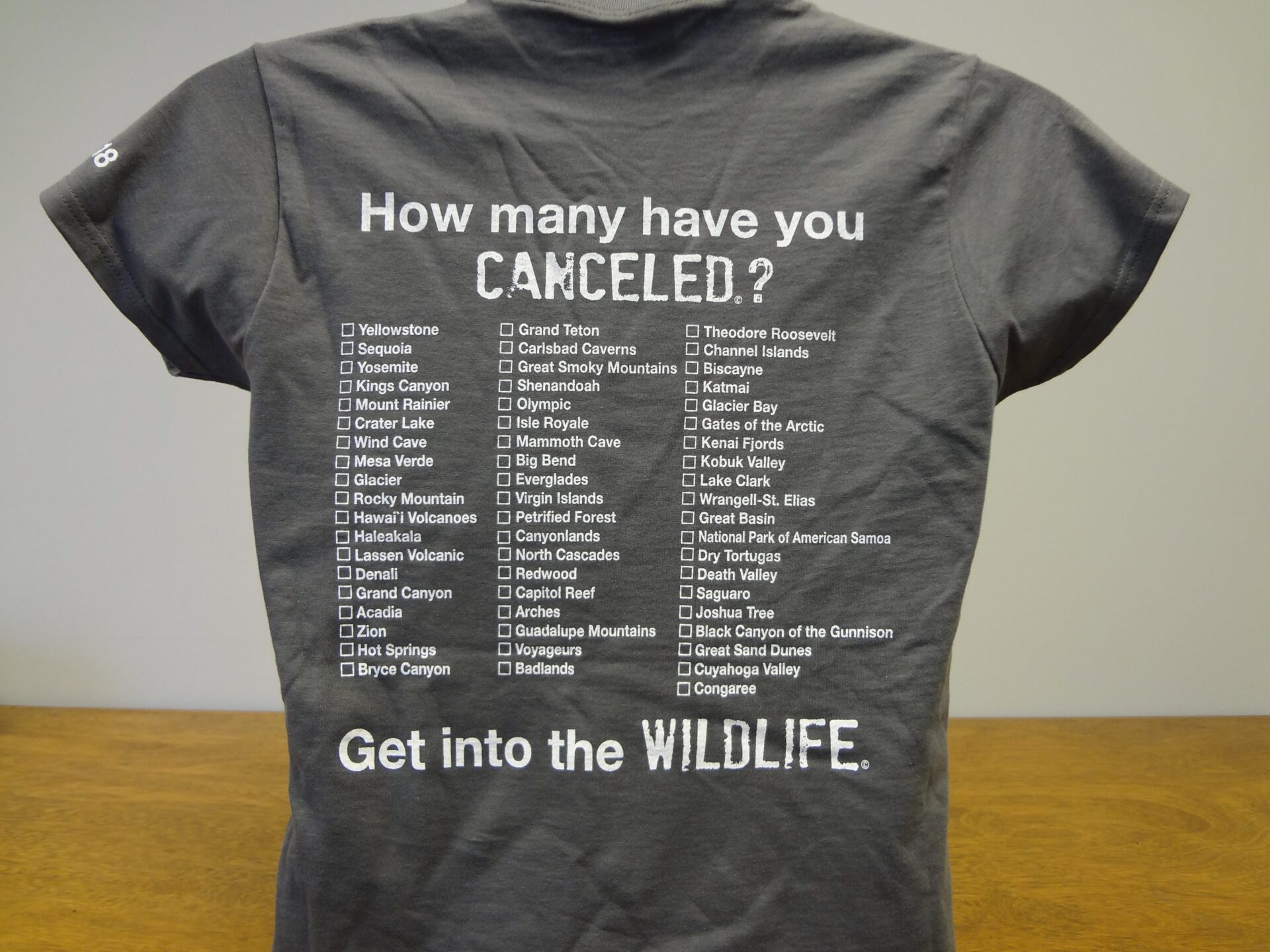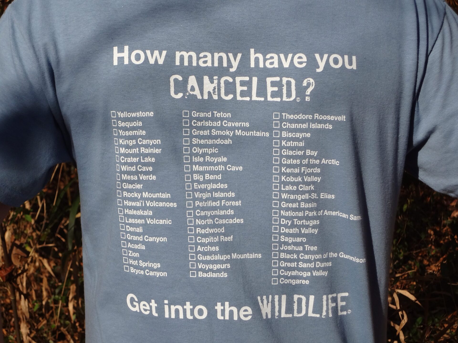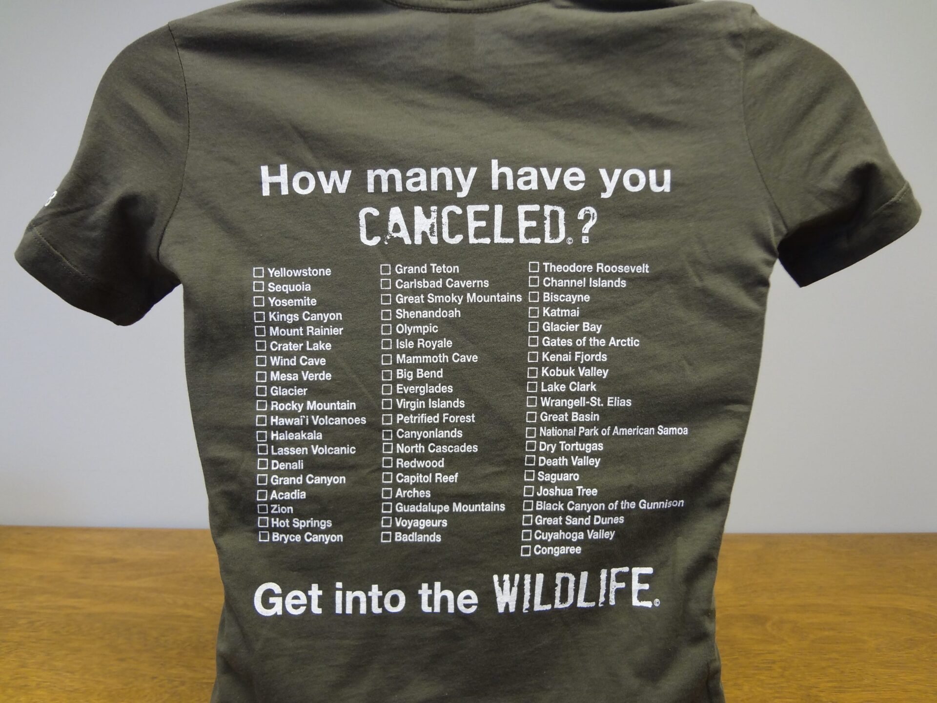 As you cancel a park, you simply color in the box on the back of your tee shirt. You should use a black permanent marker or dark fabric market. It is fun, rewarding and provides you with a tremendous sense of pride.